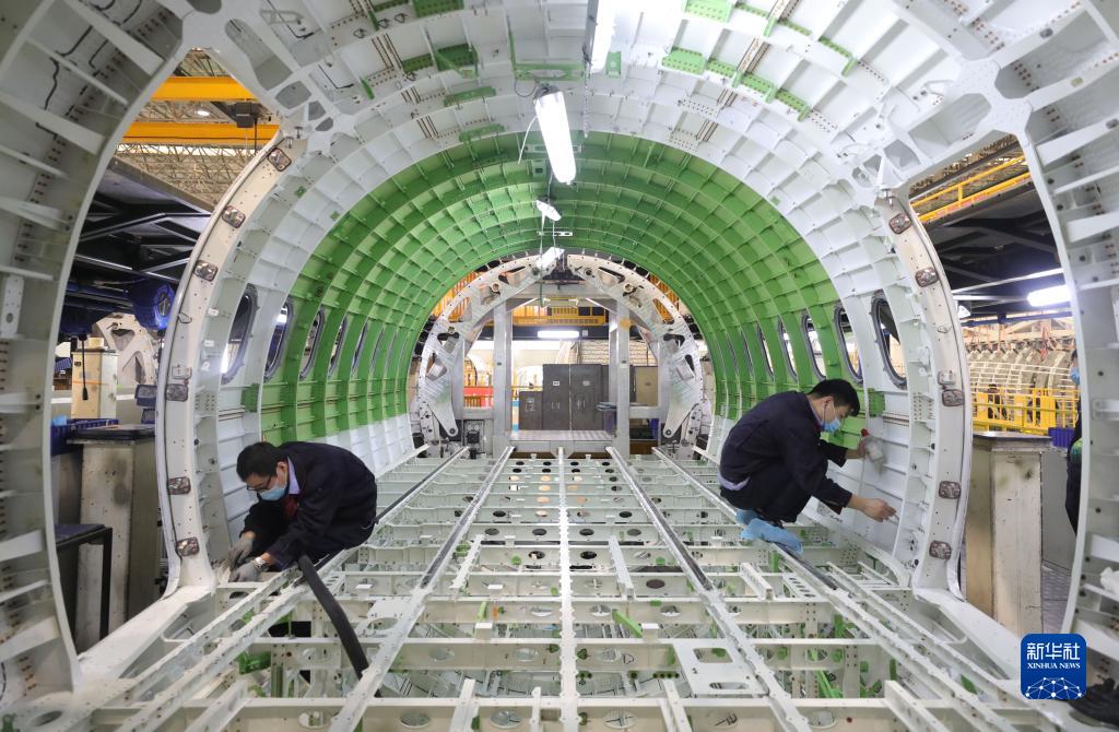 在中航沈飛民用飛機有限責任公司空客A220項目車間,工人在生產飛機(2020年3月6日攝)。新華社記者 楊青 攝
