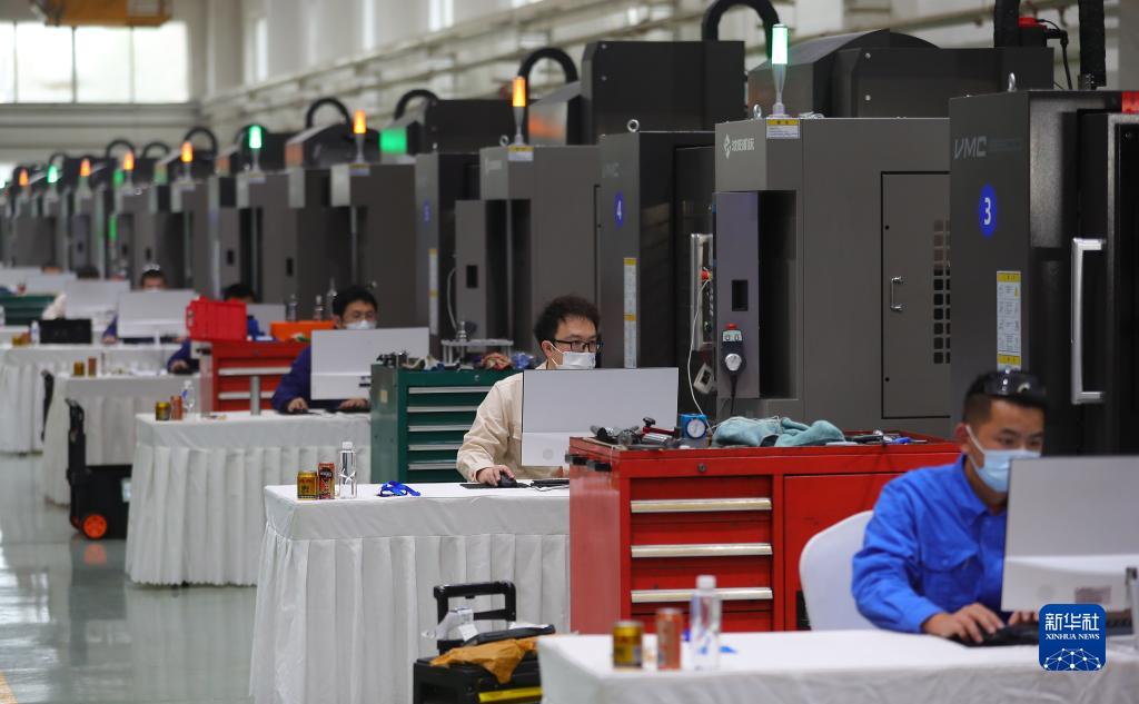 11月10日,參賽選手在數(shù)控多軸加工比賽中比拼。當日,2022“一帶一路”暨金磚國家技能發(fā)展與技術創(chuàng)新之“通用技術杯”數(shù)控多軸加工大賽在通用技術集團沈陽機床開賽。新華社記者 楊青 攝