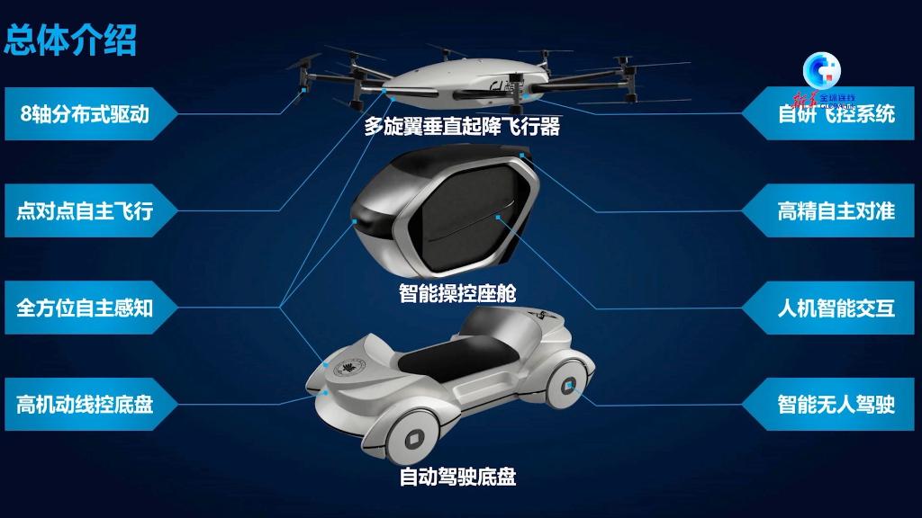 該飛行汽車采用了自主垂直起降飛行器、智能操控座艙和自動駕駛底盤三個獨立模塊的分體式構(gòu)型,是面向載人、載物的立體運載系統(tǒng)。