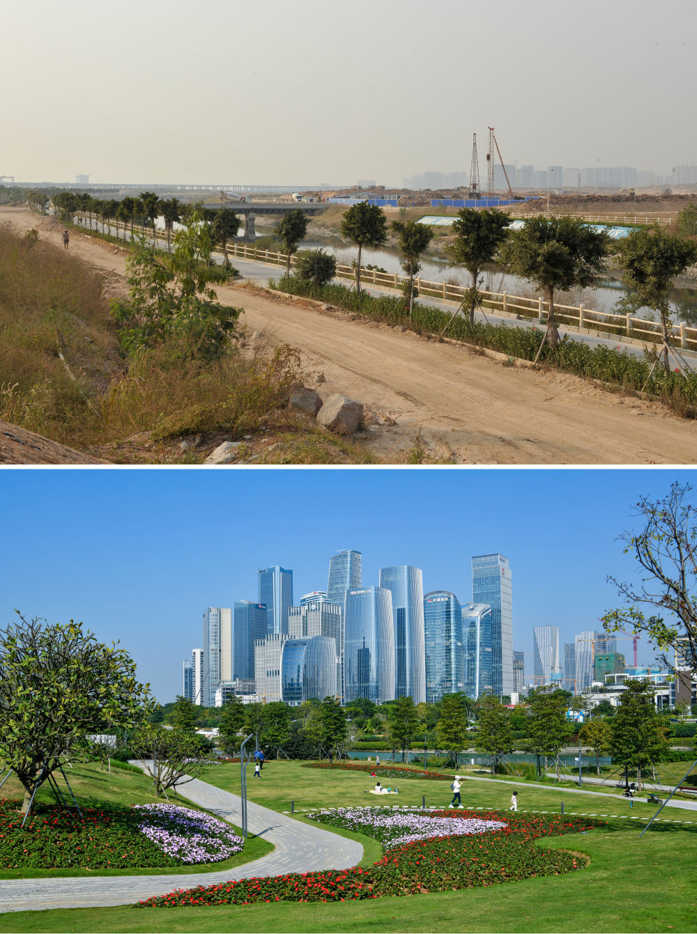 ↑拼版照片上圖:2012年10月22日拍攝的前海,河道兩旁一片荒蕪;下圖:2022年12月8日拍攝的前海,河道兩旁已變成鳥語花香的公園。