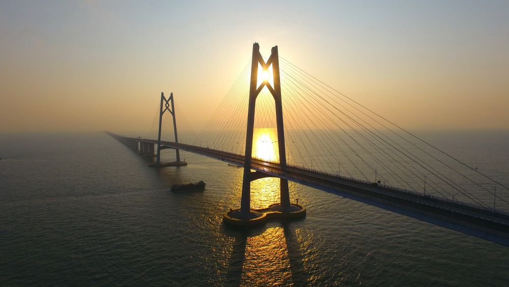 當我操作無人機飛行在浩瀚的伶仃洋上,從屏幕里看到一輪紅日躍出海面、金色的陽光穿過“中國結”橋塔、長橋臥波宛若蛟龍,內心的震撼無與倫比。