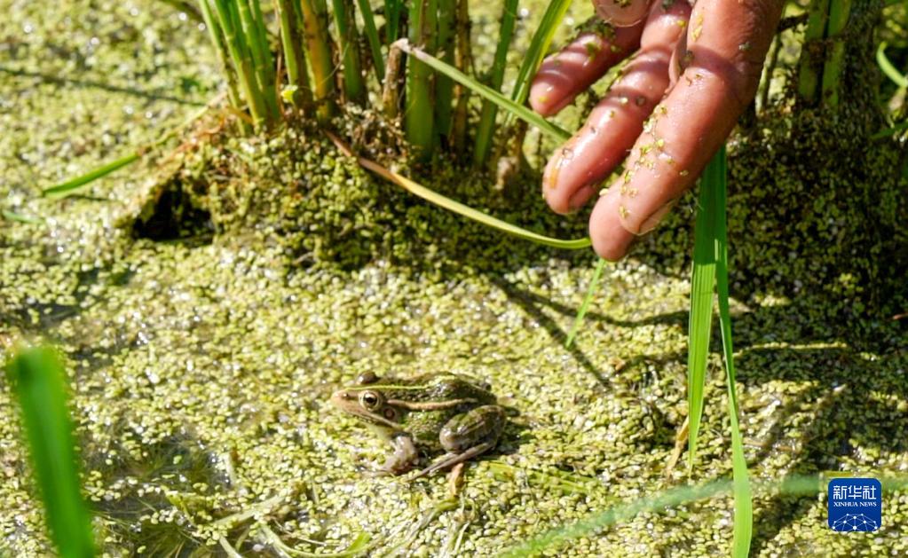 這是吉林省白城市鎮賚縣慶江種養殖農民專業合作社有機稻田中的青蛙(2022年7月12日攝)。新華社記者 王帆 攝