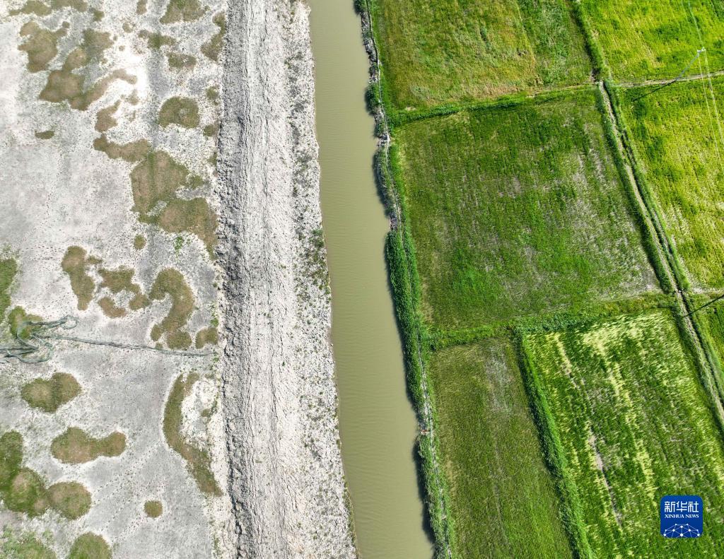 這是2022年7月12日拍攝的吉林省白城市鎮賚縣的稻田(右)與鹽堿灘涂(無人機照片)。新華社發(潘晟昱 攝)