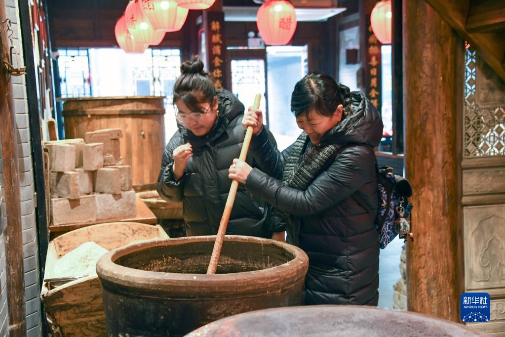 游客在平遙古城東湖老醋坊內體驗陳醋發酵打耙(2022年1月28日攝)。新華社發(梁生仁攝)