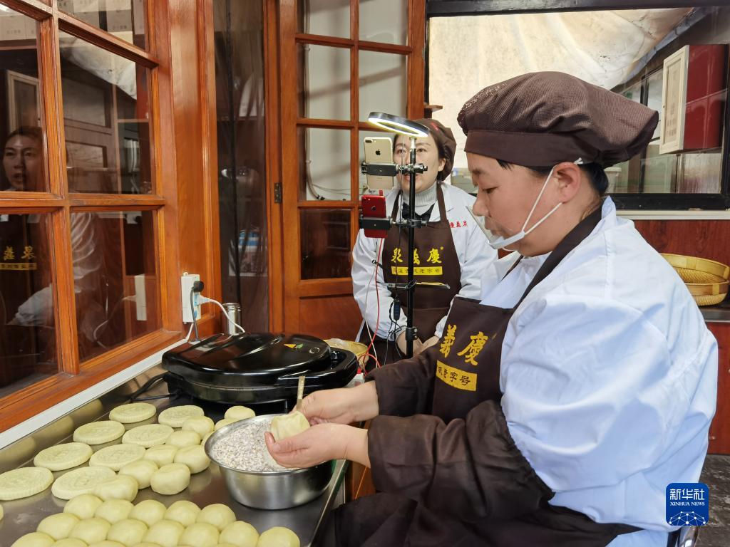 在平遙古城慶義泉爐食鋪內,工人們忙著打月餅、直播賣貨(2022年1月25日攝)。新華社記者王學濤攝