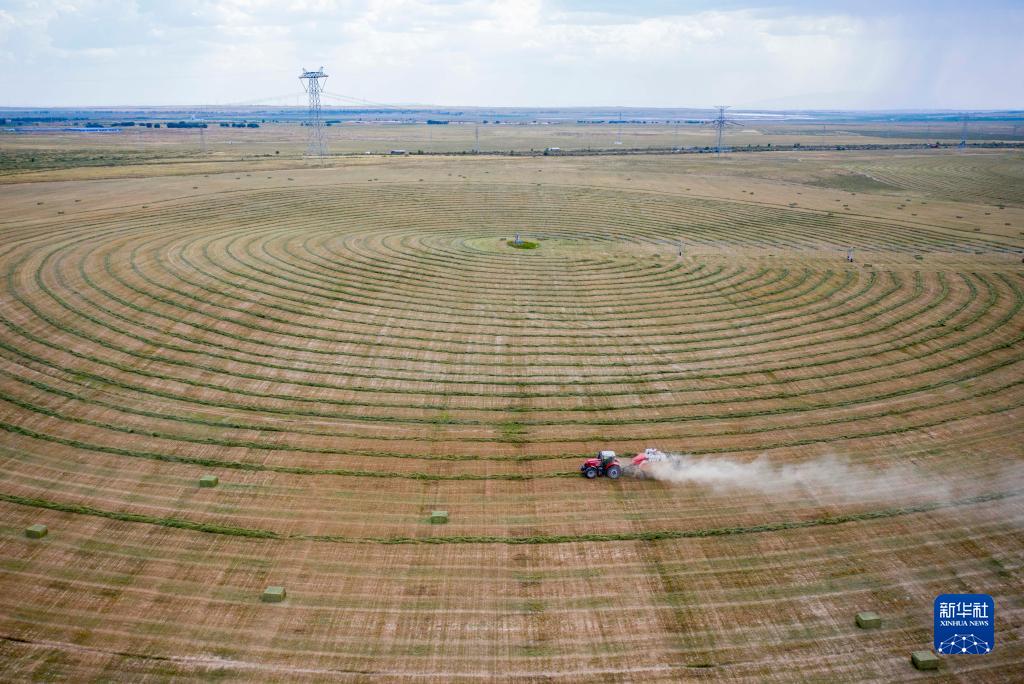 在寧夏鹽池縣馮記溝鄉(xiāng)平臺(tái)村的優(yōu)質(zhì)牧草基地,農(nóng)戶用機(jī)械將牧草打捆(無(wú)人機(jī)照片,2021年7月14日攝)。新華社記者 楊植森 攝