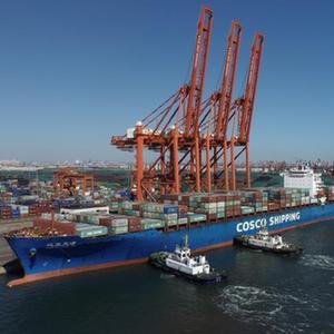 一艘輪船在拖輪的協(xié)助下向唐山港京唐港區(qū)集裝箱碼頭靠泊(2021年10月23日攝,無(wú)人機(jī)照片)。新華社記者 朱旭東 攝