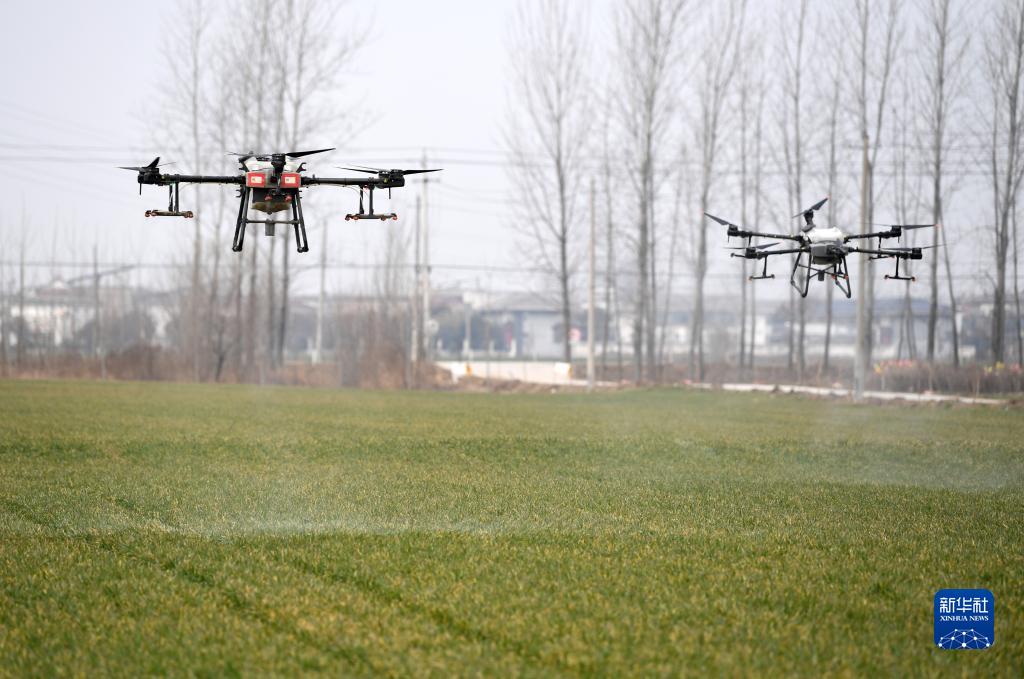 2月11日,無人機在安徽省亳州市譙城區趙橋鄉“無人農場”噴灑除草劑。新華社記者 劉軍喜 攝