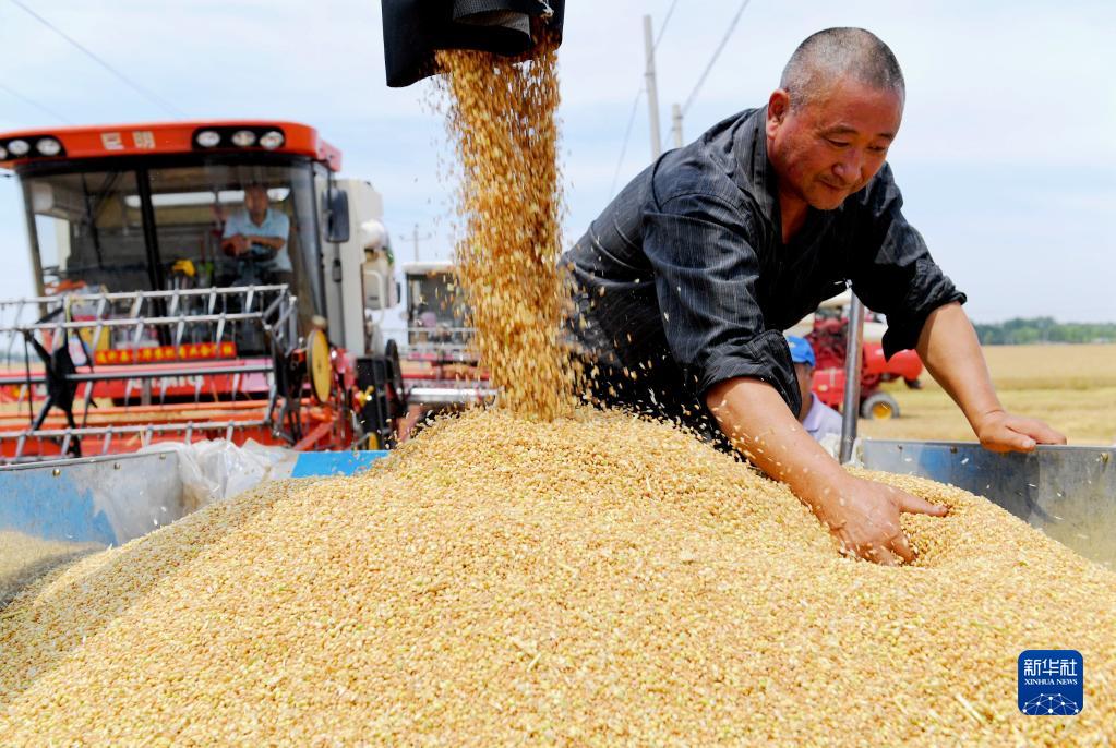 河北省衡水市阜城縣崔家廟鎮前磚門村農民在麥田收獲小麥(2021年6月13日攝)。新華社記者 朱旭東 攝