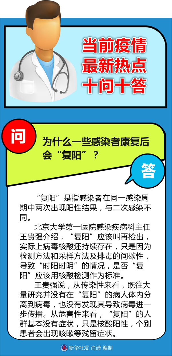 王貴強說,從傳染性來看,既往大量研究并沒有在“復陽”的病人體內分離到病毒,也沒有發現其導致病毒進一步傳播。從危害性來看,“復陽”的人群基本沒有癥狀,只是核酸陽性,個別患者會出現咳嗽等殘留癥狀。