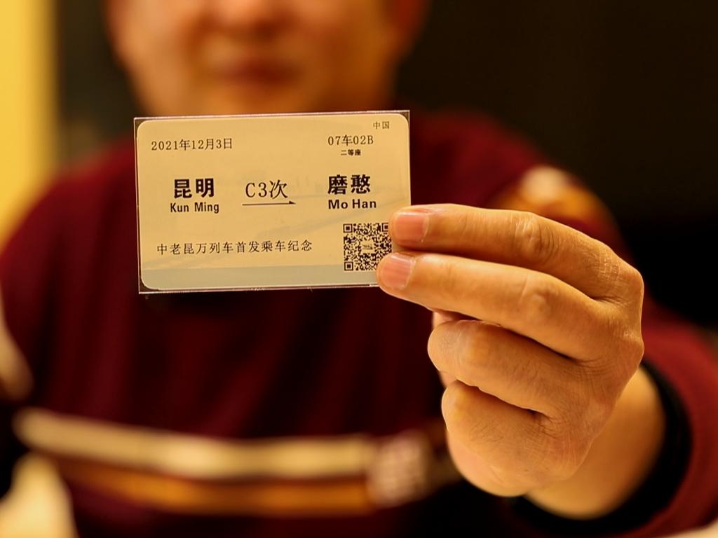 孫昆育手持中老鐵路首發列車紀念票。新華社記者王安浩維 攝