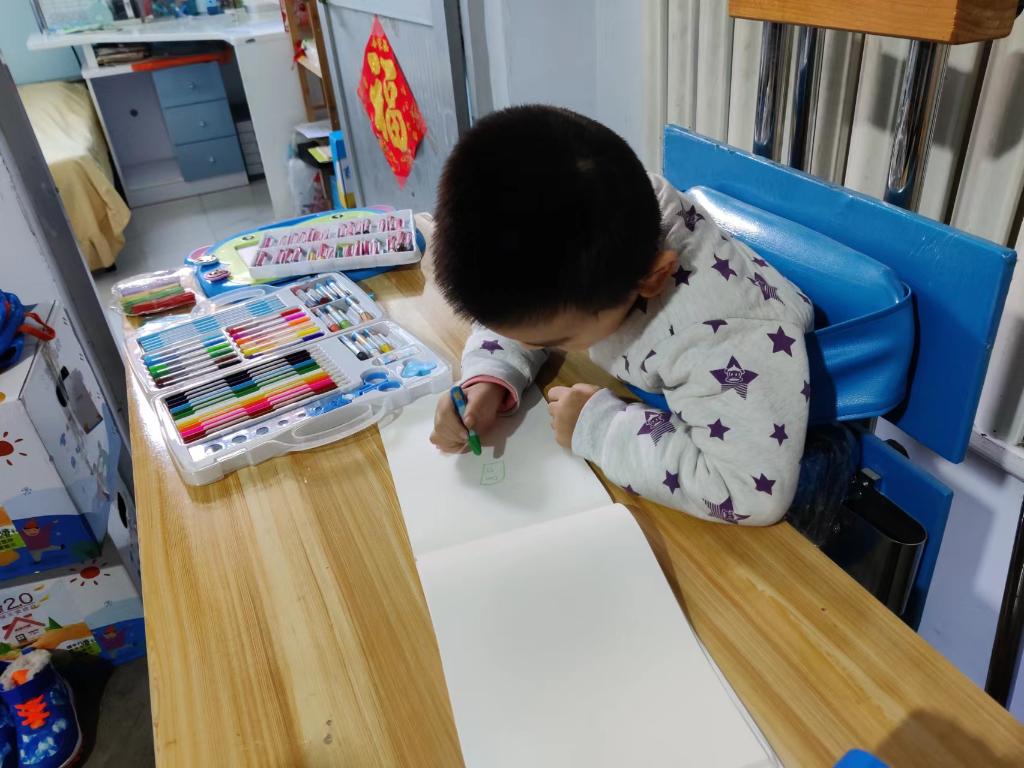 李佳樹在器械的輔助下站著畫畫。新華社記者邵魯文 攝