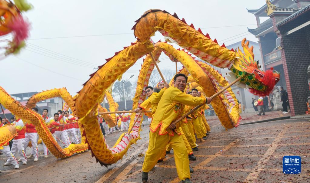 1月22日,湖南省常寧市勝橋鎮合泉村村民在舞龍。新華社發(周秀魚春 攝)