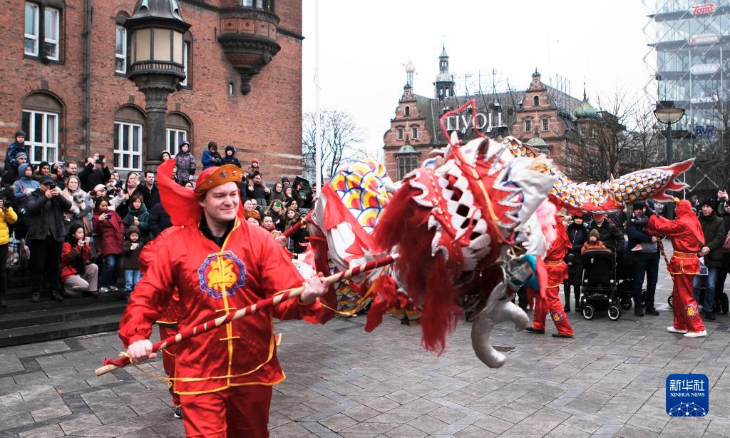 1月21日,人們在丹麥首都哥本哈根市政廣場觀看舞龍表演。新華社記者 林晶 攝