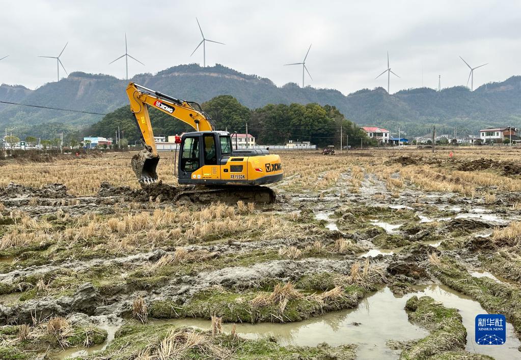 1月14日,在湖南省湘鄉(xiāng)市梅橋鎮(zhèn)一處高標(biāo)準(zhǔn)農(nóng)田建設(shè)現(xiàn)場(chǎng),工人駕駛挖掘機(jī)平整土地。新華社記者 謝奔 攝