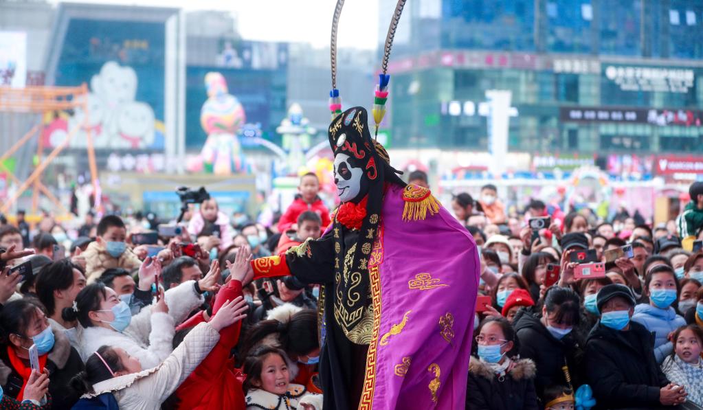 春節(jié)期間,市民在四川省瀘州市江陽(yáng)區(qū)華陽(yáng)街道世紀(jì)城文化廣場(chǎng)觀看川劇絕活“變臉”表演。新華社發(fā)