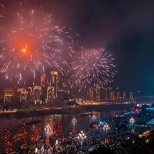 除夕夜,游客市民在重慶南濱路觀賞光影無(wú)人機(jī)焰火表演。重慶市南岸區(qū)文旅委供圖