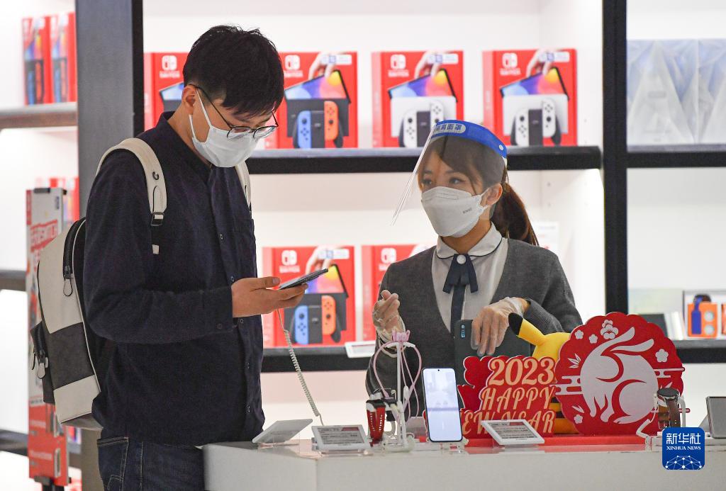 1月19日,消費(fèi)者在中免集團(tuán)海口日月廣場(chǎng)免稅店選購(gòu)電子產(chǎn)品。新華社記者 蒲曉旭 攝