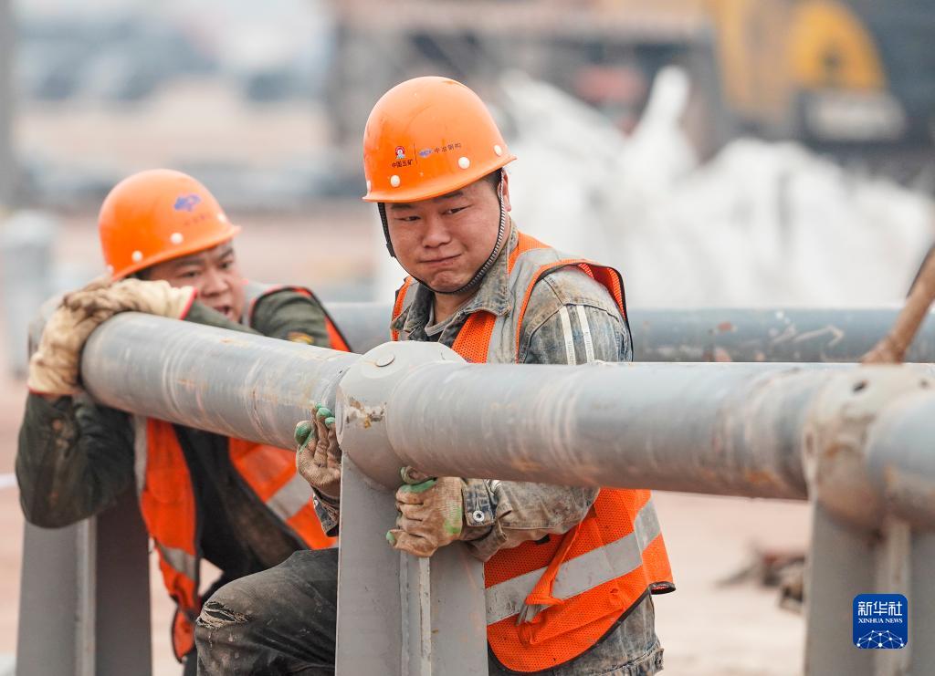 1月23日,工人在重慶兩江新區(qū)新能源汽車產(chǎn)業(yè)園基礎(chǔ)設(shè)施配套項(xiàng)目現(xiàn)場(chǎng)進(jìn)行鋼結(jié)構(gòu)材料拼裝作業(yè)。新華社記者 劉潺 攝