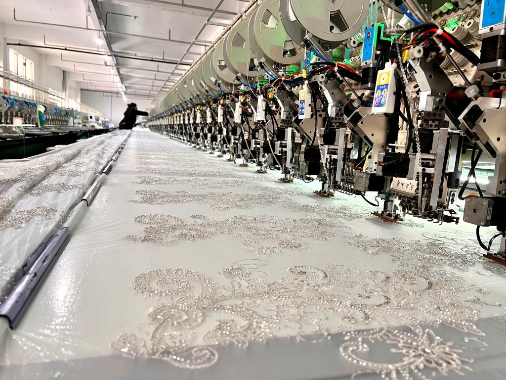 新時代婚紗廠繡花車間內,電腦繡花機正在運轉。新華社記者馬姝瑞 攝