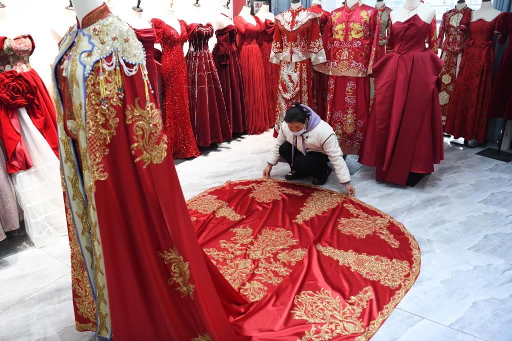 丁集鎮一家婚紗店內,工作人員正在整理中式婚服。新華社記者張端 攝