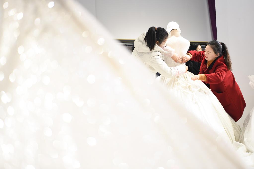 在“中國·丁集婚紗特色小鎮”里,蔣厚會(右)正在整理店內的婚紗樣品。新華社記者張端 攝