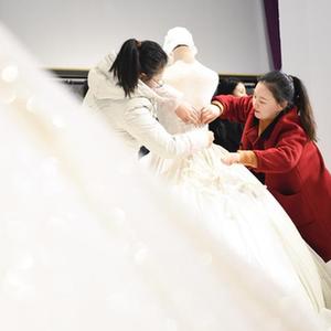 “一款婚紗能賣三五年的情況已經不復存在了。比如我的這家實體店,開業不到三年已經陸續更新了幾百款婚紗,還上架了近年來特別受歡迎的秀禾服等中式婚服,無論是整體設計,還是材質、圖案、顏色等細節,幾乎每個月都有變化。”蔣厚會一邊整理著店里的婚紗樣品,一邊詳細解釋說。