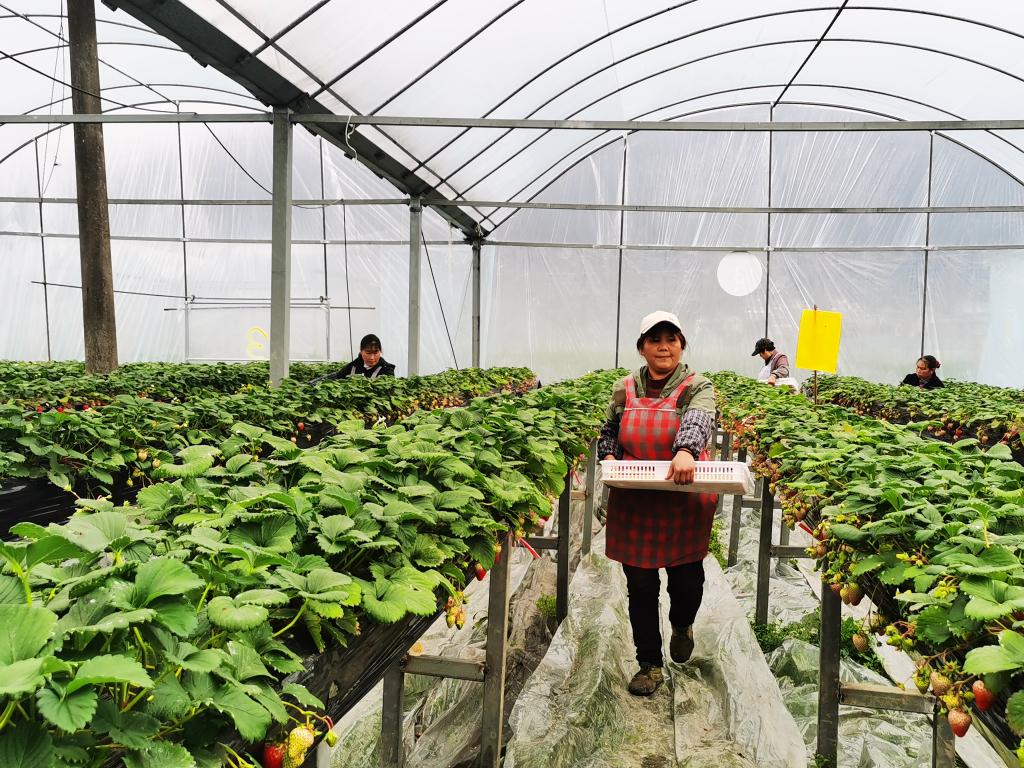 2月8日,工人在泗渡農場大棚里采摘草莓。新華社記者 鄭明鴻 攝
