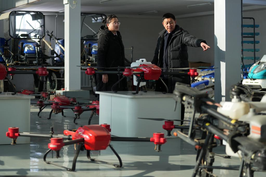 2月14日,孫斌(右)在黑龍江省樺南縣鴻源水稻專業合作社的現代水田農機展示區介紹無人機使用情況。新華社記者王建威 攝