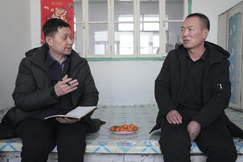 2月14日,孫斌(左)在黑龍江省樺南縣明義鄉清茶村村民羅士金家了解情況。新華社記者王建威 攝