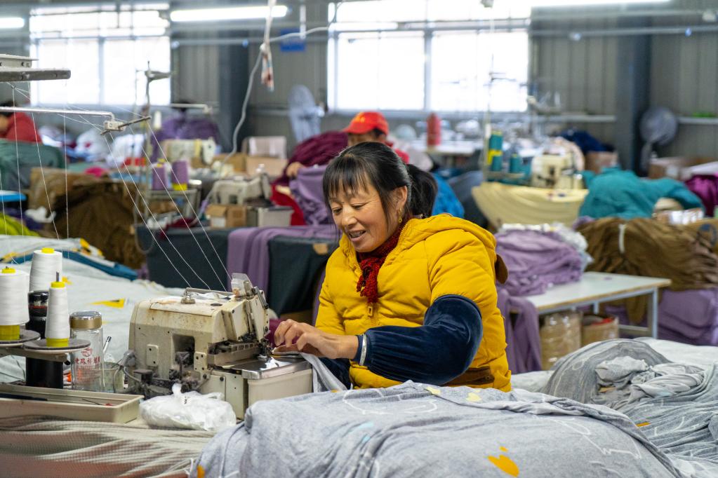 在安徽省安慶市岳西縣古坊鄉(xiāng),日光燈把安徽功茗坊農(nóng)業(yè)科技有限公司的紡織車間照得透亮。工人們腳踏縫紉機,針腳在五顏六色的布品上跳躍著,不一會兒,一件沙發(fā)套就做成了。