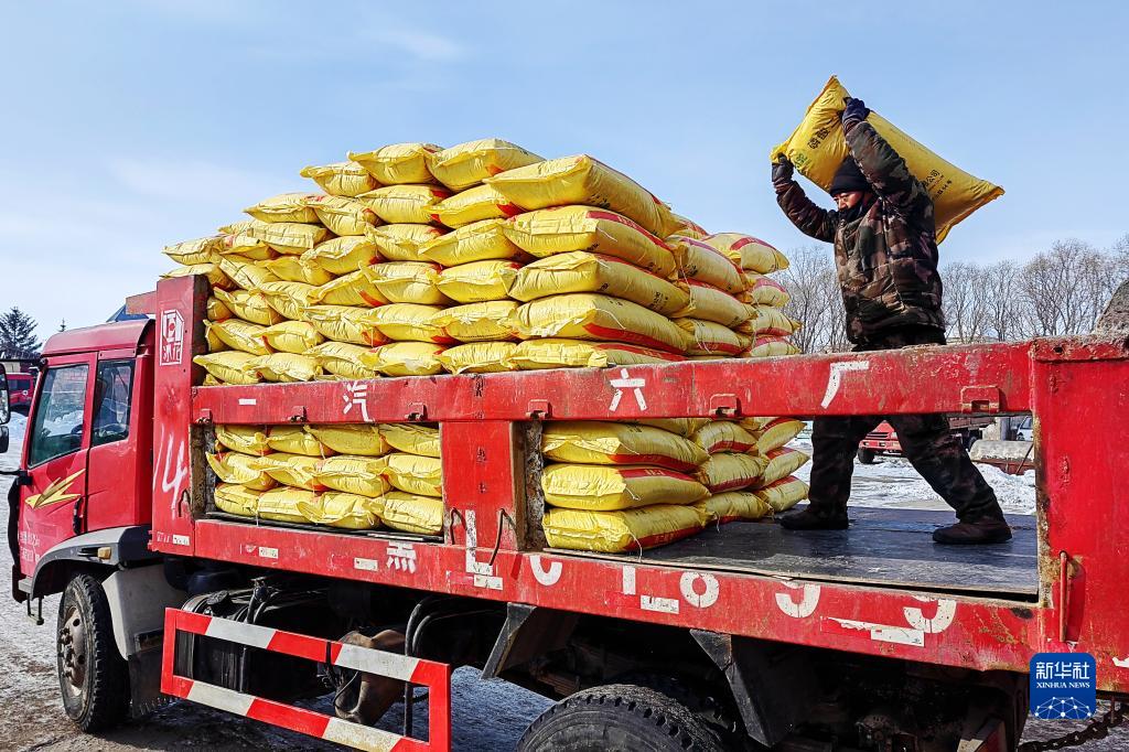 北大荒集團(tuán)五大連池農(nóng)場科技服務(wù)中心工人在裝運(yùn)肥料(2月16日攝)。新華社發(fā)(陸文祥 攝)