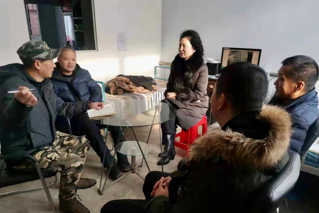 2022年2月16日,冉慧(右五)和天山堡村的村民座談,聽取大家的意見建議。新華社發(冉川攝)