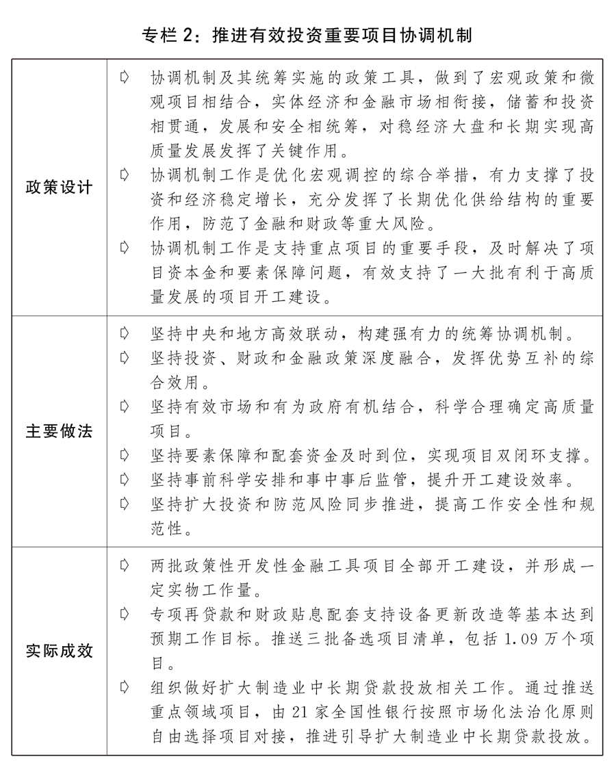 一是投資關鍵作用充分發揮。建立并高效運轉推進有效投資重要項目協調機制,強化用地、環評、用能等要素保障和重大問題協調,做到“資金、要素跟著項目走”,加快推進重點任務落實和重大項目建設,努力形成更多實物工作量。創新設立政策性開發性金融工具,分兩批投放基金7400億元,為重大項目建設補充資本金,支持的2700多個重大項目已全部開工。通過專項再貸款與財政貼息配套支持重點領域設備更新改造,推動擴大制造業中長期貸款投放。適度超前開展基礎設施投資,推進“十四五”規劃102項重大工程實施,新型基礎設施加快布局,川藏鐵路全面建設取得良好開局,裝機規模全球第二大的白鶴灘水電站全面投產,白鶴灘至江蘇、浙江特高壓直流輸電工程運行,小洋山北側集裝箱碼頭(陸域部分)、平陸運河工程、南水北調中線引江補漢工程等開工建設。發揮中央預算內投資撬動作用。加快地方政府專項債券發行使用并進一步擴大支持范圍。鼓勵引導社會資本盤活老項目、投入新項目,促進存量資產和新增投資良性循環,已累計發行上市基礎設施領域不動產投資信托基金(REITs)試點項目24個,總發行規模超過780億元。全面推進城鎮老舊小區改造,全國實際新開工老舊小區改造5.25萬個。城市基礎設施建設短板加快補齊,城市燃氣管道等老化更新改造積極推進。全國固定資產投資(不含農戶)57.21萬億元,增長5.1%;其中,基礎設施、制造業投資分別增長9.4%、9.1%,一定程度彌補了消費收縮缺口。