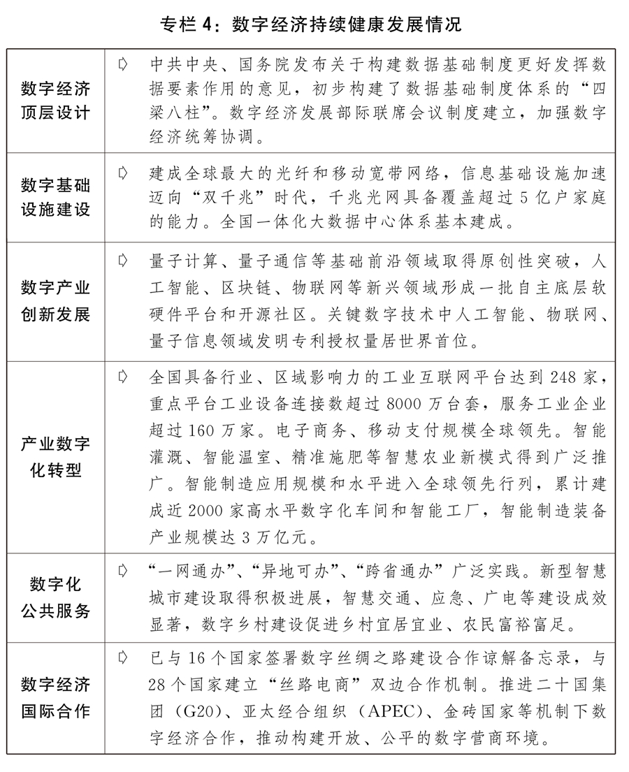 三是加快發展數字經濟。推動數字產業創新發展,培育一批具有國際競爭力的生態主導型企業和數字產業集群。研究制定數據產權制度、數據交易市場等基礎制度配套政策文件,加強開源體系建設頂層設計。推動數字技術與實體經濟深度融合,加強數字化轉型頂層設計,完善支持數字化轉型的政策舉措,組織實施數字化轉型工程,助力實體經濟高質量發展。深化新一代信息技術與制造業融合發展,深入實施智能制造工程,推進制造業數字化、網絡化、智能化,創新發展智慧農業,推進“數商興農”。著力推動電子商務高質量發展,積極引導直播電商、即時電商等新模式新業態發展。提升常態化監管水平,推動平臺經濟規范健康持續發展,支持平臺企業加強技術創新,賦能實體經濟轉型升級,提升國際化水平,在引領發展、創造就業、國際競爭等方面發揮更大作用。開展雙多邊數字經濟治理合作,鼓勵數字經濟企業“走出去”。