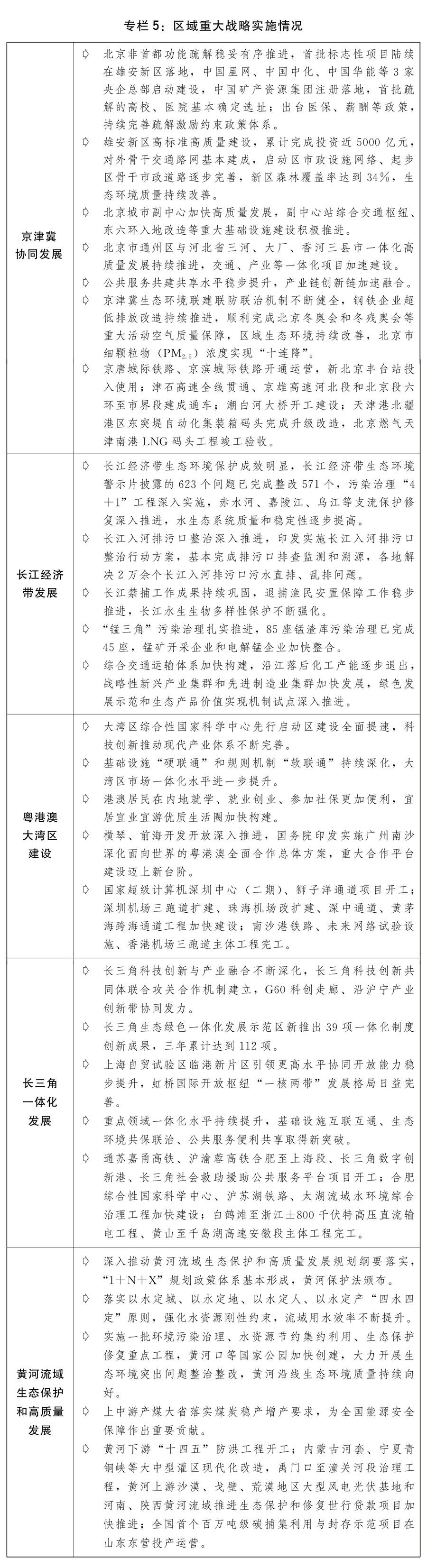 一是區域重大戰略扎實推進。京津冀協同發展水平不斷提升,一批央企、醫院、高校等疏解項目在雄安新區落地,津冀港口群基礎設施不斷完善,“軌道上的京津冀”更加便捷。長江經濟帶綠色高質量發展有力推進,長江保護法深入貫徹實施,生態環境突出問題整改、污染治理“4+1”工程成效明顯,入河排污口整治等專項行動深入實施,長江流域重點水域十年禁漁進展良好。大灣區綜合性國家科學中心先行啟動區加快建設,設施聯通和規則銜接不斷深化,橫琴、前海、南沙、河套等重大合作平臺建設深入推進。積極推動長三角科創與產業融合發展,G60科創走廊、沿滬寧產業創新帶協同發力的創新空間布局不斷優化,基礎設施、生態環境、公共服務等重點領域一體化水平明顯提升。黃河流域生態環境保護、水安全保障、文化保護傳承弘揚等專項規劃出臺實施,黃河流域生態保護和高質量發展先行區加快建設,黃河生態保護治理五大攻堅行動穩步推進。