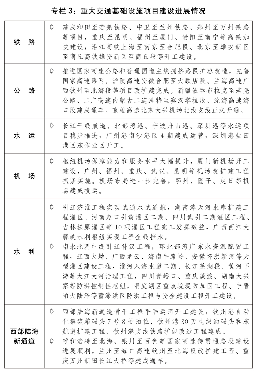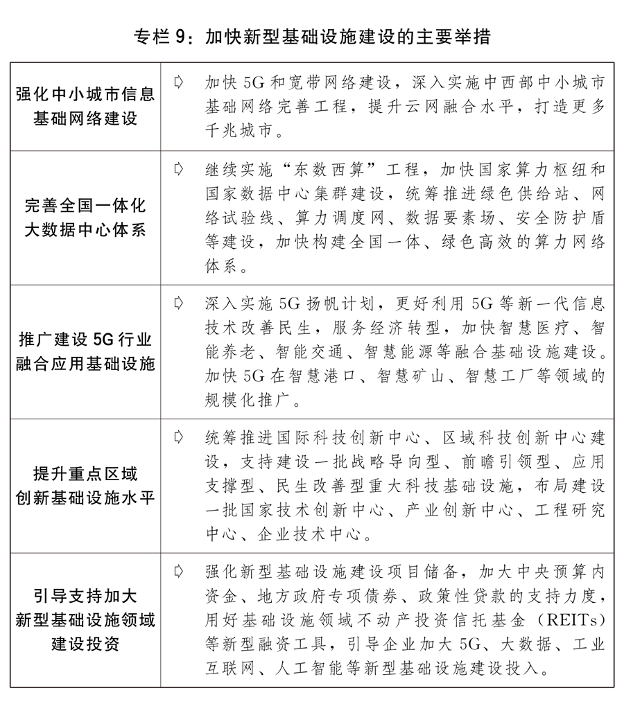 三是持續推進重大基礎設施建設。優化基礎設施布局、結構、功能和系統集成,構建現代化基礎設施體系。推動川藏鐵路、沿江沿海高鐵、國家水網等重大項目建設,加快重大引調水、防洪減災、西部陸海新通道、小洋山北側集裝箱碼頭開發建設,推進川藏公路G318線提質改造,加快沿邊國道G219線、G331線待貫通路段建設,推進中西部鐵路、長江黃金水道、過江通道、重點城市群都市圈城際鐵路和市域(郊)鐵路建設。加快5G、人工智能、大數據、物聯網、工業互聯網等新型基礎設施建設,推動智慧高速公路建設,推進民用空間基礎設施建設,加快推進海南商業航天發射場建設,優化升級數字基礎設施,加快建設信息網絡基礎設施,推進云網融合和算網協同發展,有序推進基礎設施智能升級。