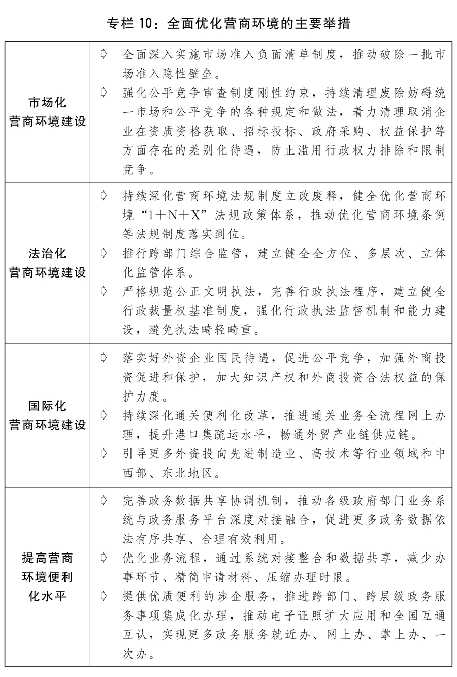三是營造市場化法治化國際化一流營商環境。深化簡政放權、放管結合、優化服務改革。堅持依法行政,嚴格規范公正文明執法,帶頭遵守契約,提高政府公信力和執行力。強化公平競爭審查制度剛性約束,持續清理修改不符合優化營商環境條例的規章和規范性文件,推動各地結合實際出臺配套政策措施,促進全國范圍營商環境持續改善。深化營商環境創新試點,支持有條件的地方率先加大營商環境改革力度。不斷優化中國營商環境評價體系,健全中國營商環境評價長效機制。制定進一步提升重點區域、工業園區等營商環境水平的行動方案,推動城市群、都市圈等重點區域營商環境一體化發展。推動建立涉企收費長效監管機制。充分發揮全國一體化政務服務平臺“一網通辦”樞紐作用,深入推進“一件事一次辦”改革舉措,加快電子證照應用,持續提升政務服務“跨省通辦”質效。建立企業信用狀況綜合評價體系,強化企業信用風險分類管理,完善社會信用統一代碼制度,加強信用信息共享應用,促進中小微企業融資便利。