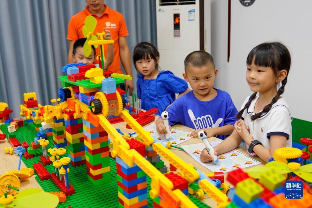在重慶豐都縣高家鎮汶溪社區黨群服務中心內,幾名加入家庭教育互助會的孩子在體驗兒童機器人課程(2022年8月24日攝)。豐都縣的鄉村、社區家庭教育互助會致力于服務豐都外出務工家庭及留守兒童。新華社記者 劉潺 攝