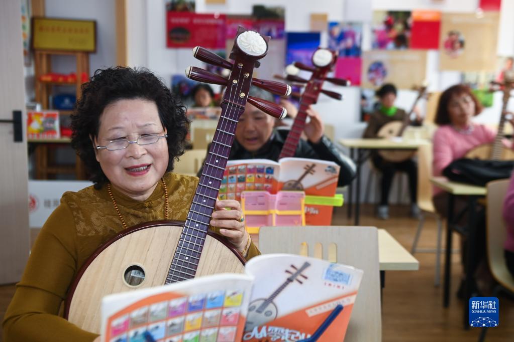 在浙江省嘉興市南湖區桂苑社區的老年大學活動室內,老人們在老師的指導下學琴(2023年3月7日攝)。新華社記者 徐昱 攝