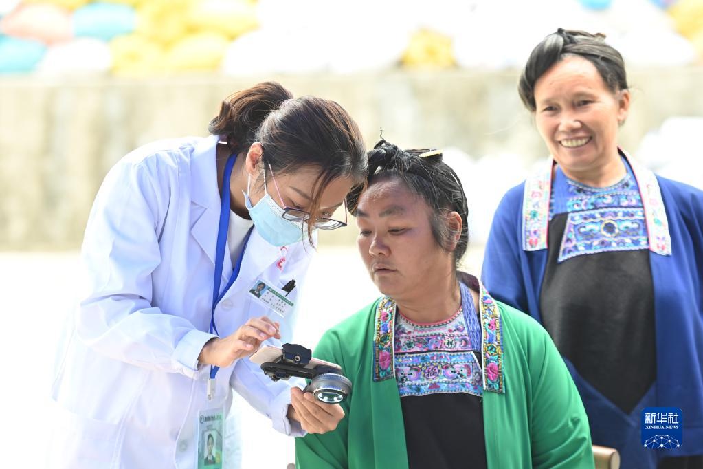 在廣西融水苗族自治縣白云鄉幫陽村,來自廣東醫科大學附屬醫院的李芳谷博士(左)在“送醫進苗寨”活動上給村民提供醫療服務(2022年10月26日攝)。新華社記者 黃孝邦 攝