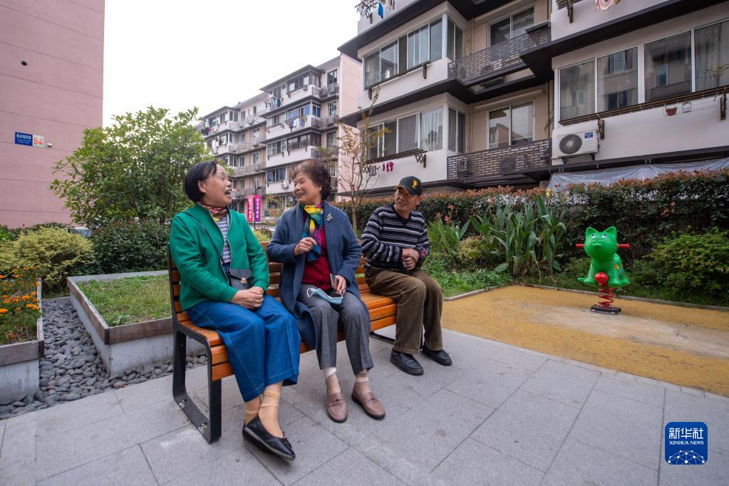 浙江省杭州市西湖區北山街道松木場社區的居民在老舊小區改造后建成的休閑場地聊家常(2022年11月1日攝)。新華社記者 江漢 攝