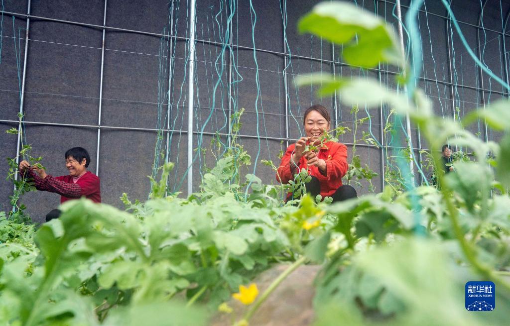 農戶在河北滄州渤海新區黃驊市一處農業科技示范園為西瓜秧整枝(2023年2月11日攝)。新華社記者 駱學峰 攝