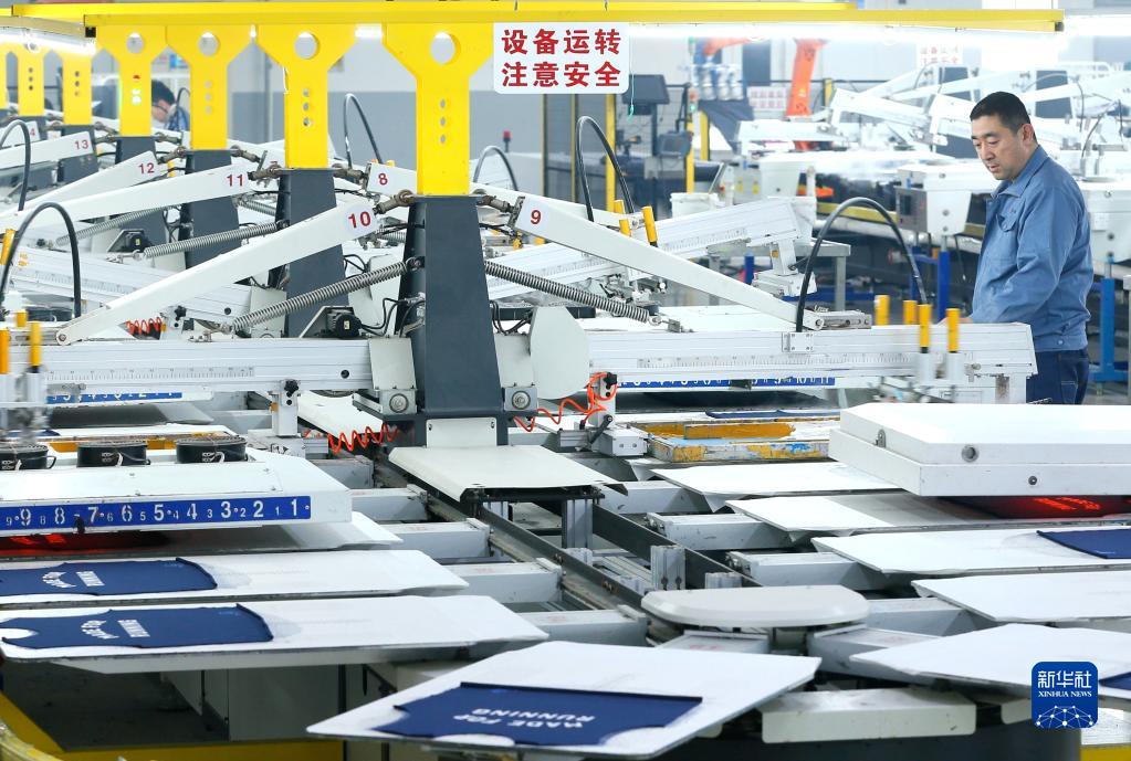 山東省青島市即墨區青島華信印花有限公司的工人在智能印花生產線上生產出口產品(2023年3月14日攝)。新華社發(梁孝鵬 攝)