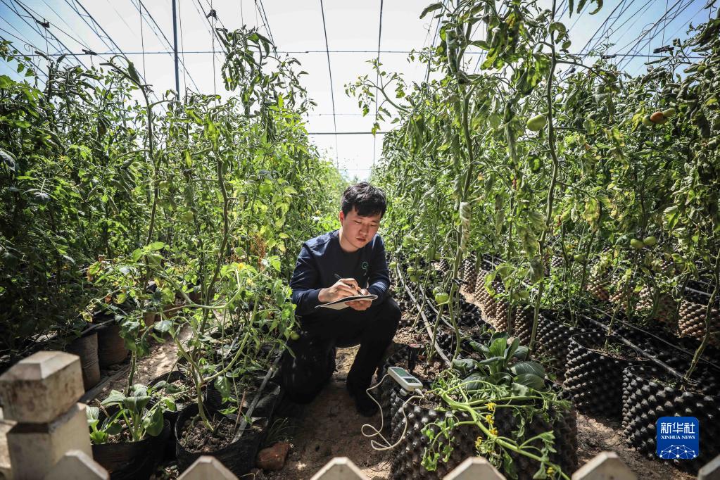 在遼寧省盤錦市大洼區田家街道大堡子村,回鄉創業大學生郭佳明在溫室大棚內查看堿地西紅柿的生長情況(2019年4月15日攝)。新華社記者 潘昱龍 攝