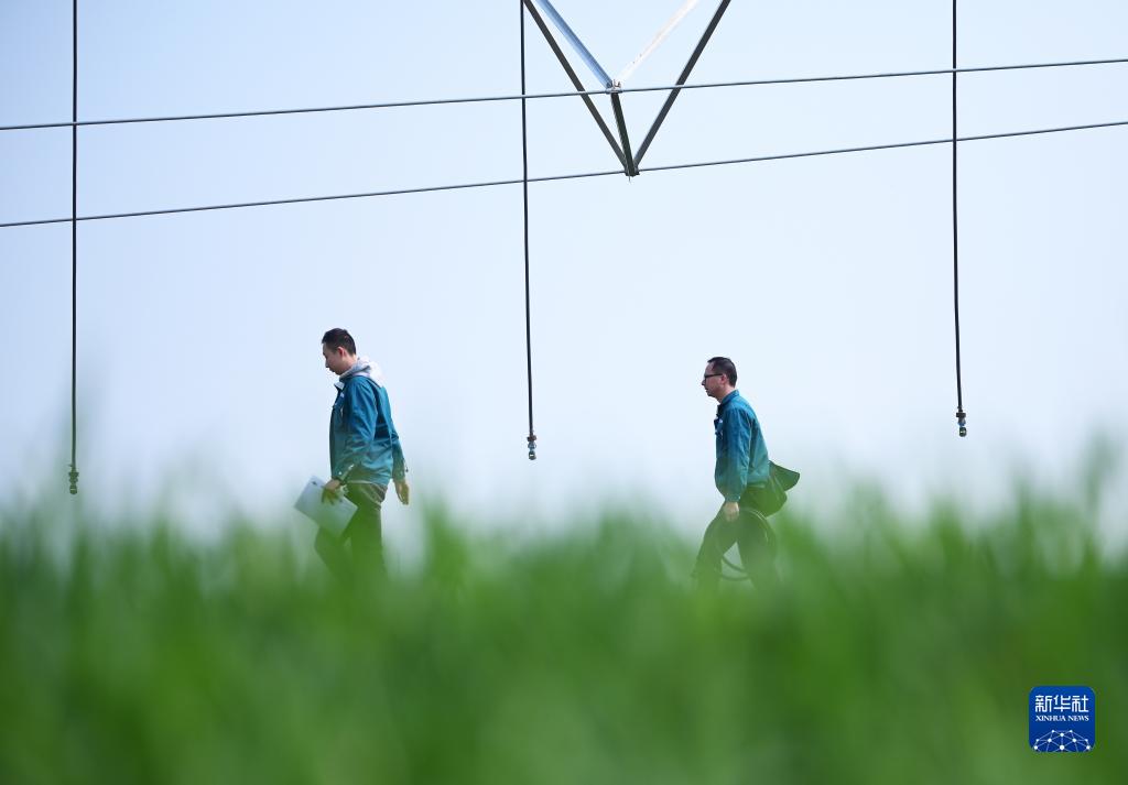 在河南省駐馬店市西平縣老王坡高標準農田示范區,劉亞輝(右)和王英凡在對平移式水肥一體化噴灌機進行巡檢(2023年2月28日攝)。新華社記者 張浩然 攝