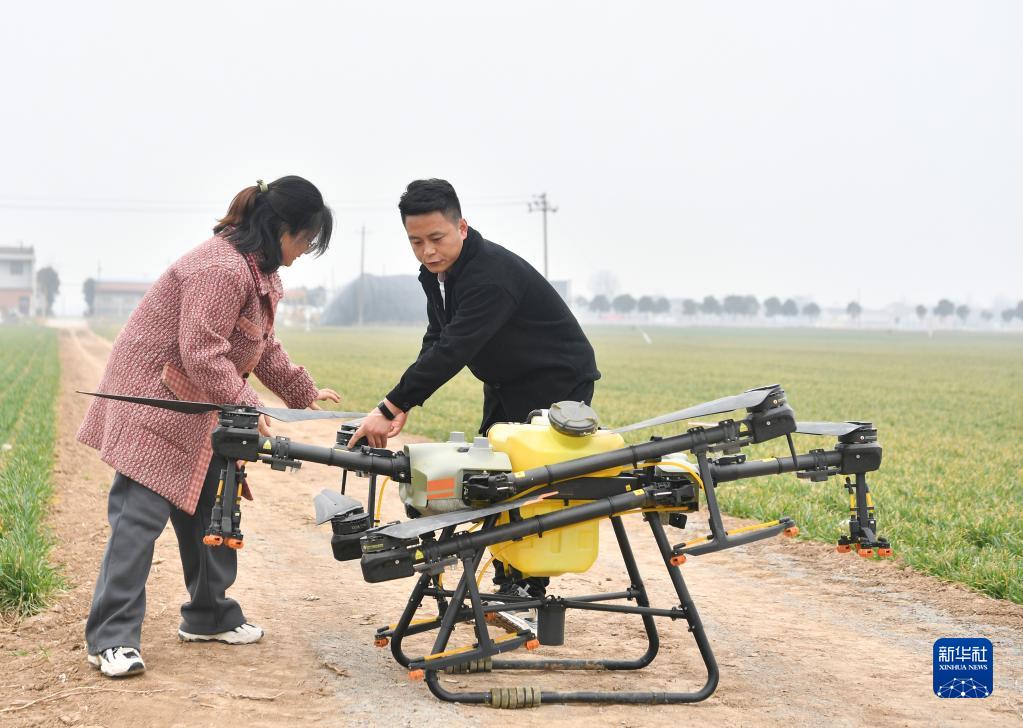 在陜西省寶雞市陳倉區慕儀鎮齊西村的農田,齊葉葉(左)與齊昆調試植保無人機(2023年2月27日攝)。新華社記者 張博文 攝
