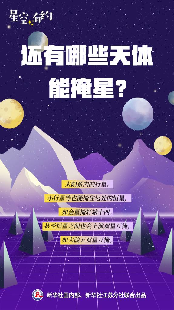 事實上,太陽系內的行星、小行星等也能掩住遠處的恒星,如金星掩軒轅十四。甚至恒星之間也會上演雙星互掩,如大陵五雙星互掩。這一類天象在天文學上被統稱為掩星。