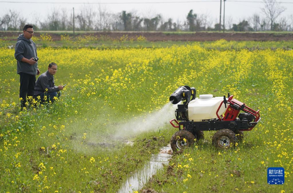 在位于江西省南昌縣蔣巷鎮的大田農社,無人植保機正在對油菜進行植保作業(2021年3月12日攝)。 新華社記者 萬象 攝