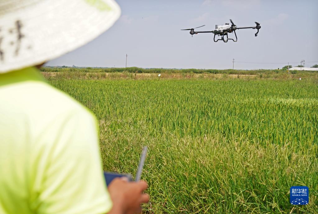 在位于江西省南昌縣蔣巷鎮的大田農社,農民正在操控無人機為稻田施肥(2022年9月16日攝)。 新華社記者 萬象 攝